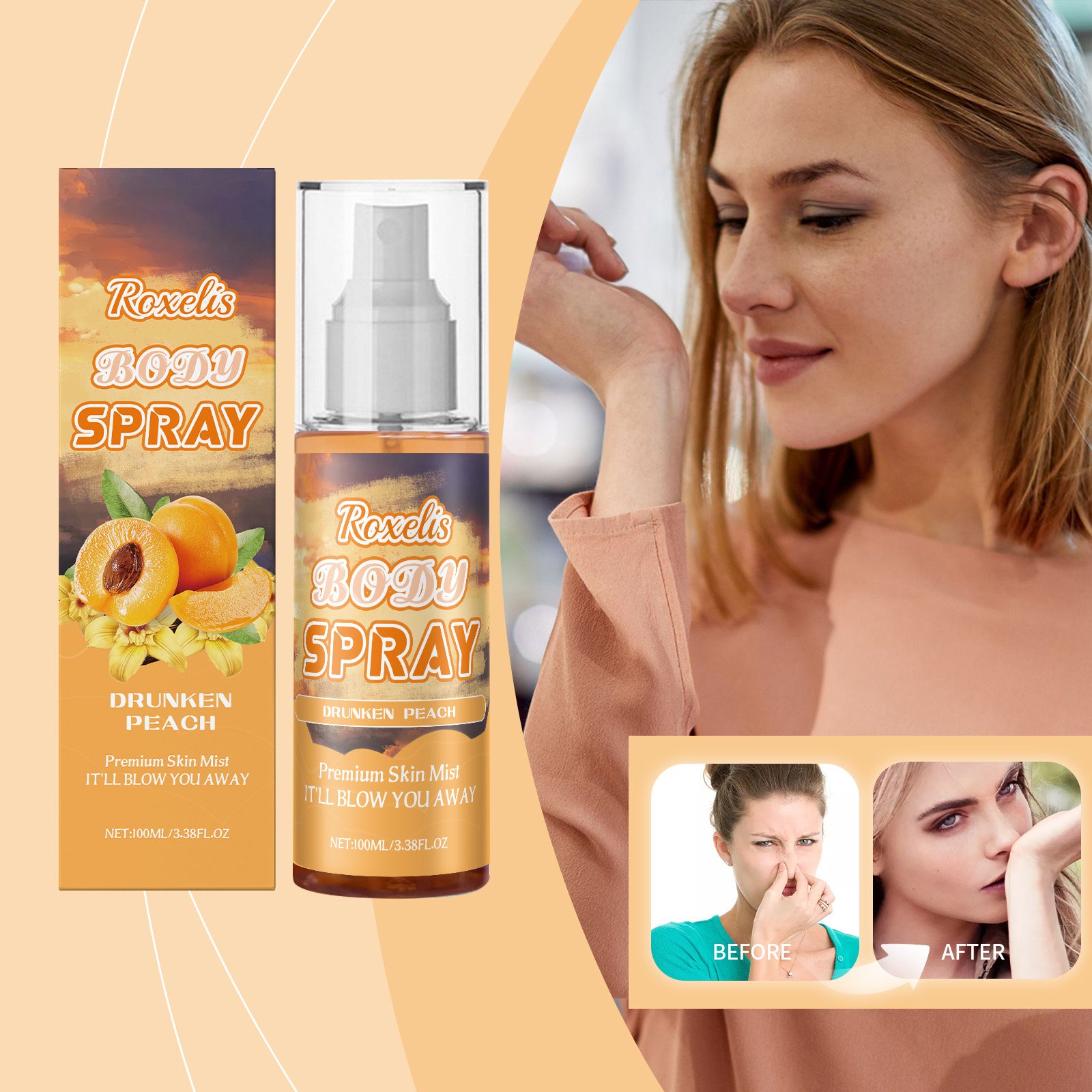 Our Peach Champagne Body Fragrance Spray contains PEG-40 hydrogenated castor oil and ethylhexylglycerin. It delivers multi-layered aromas to enhance charm, deeply moisturizes the skin, and improves comfort. The usage method is simple: spray the product on the wrists, neck, and behind the ears, or spray it into the air and walk into the mist to let it evenly spread over the entire body, leaving a fragrant scent. Additionally, it can soothe and relax, improve mood, and reduce stress.