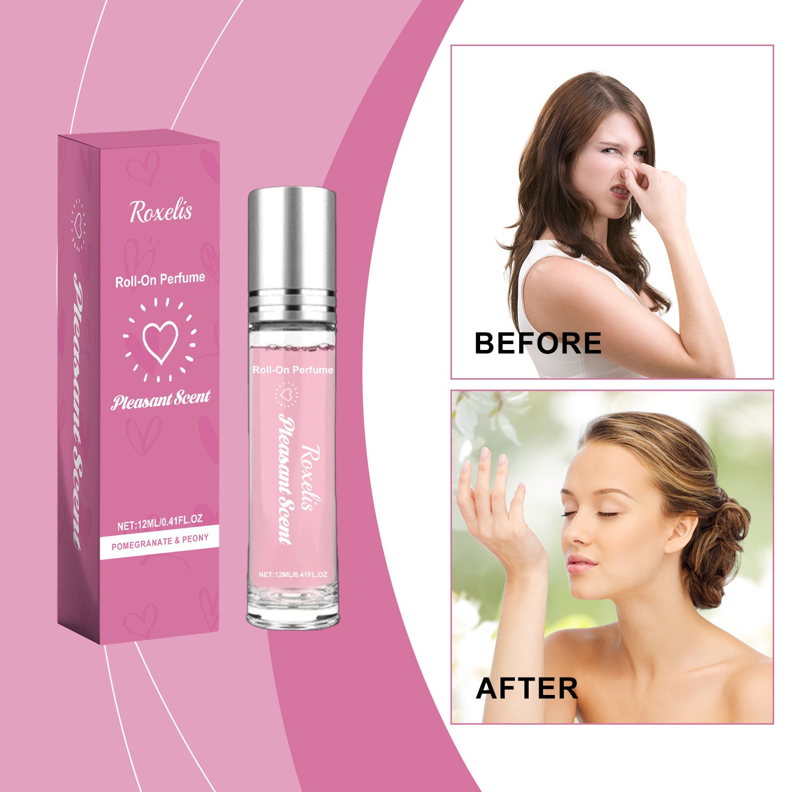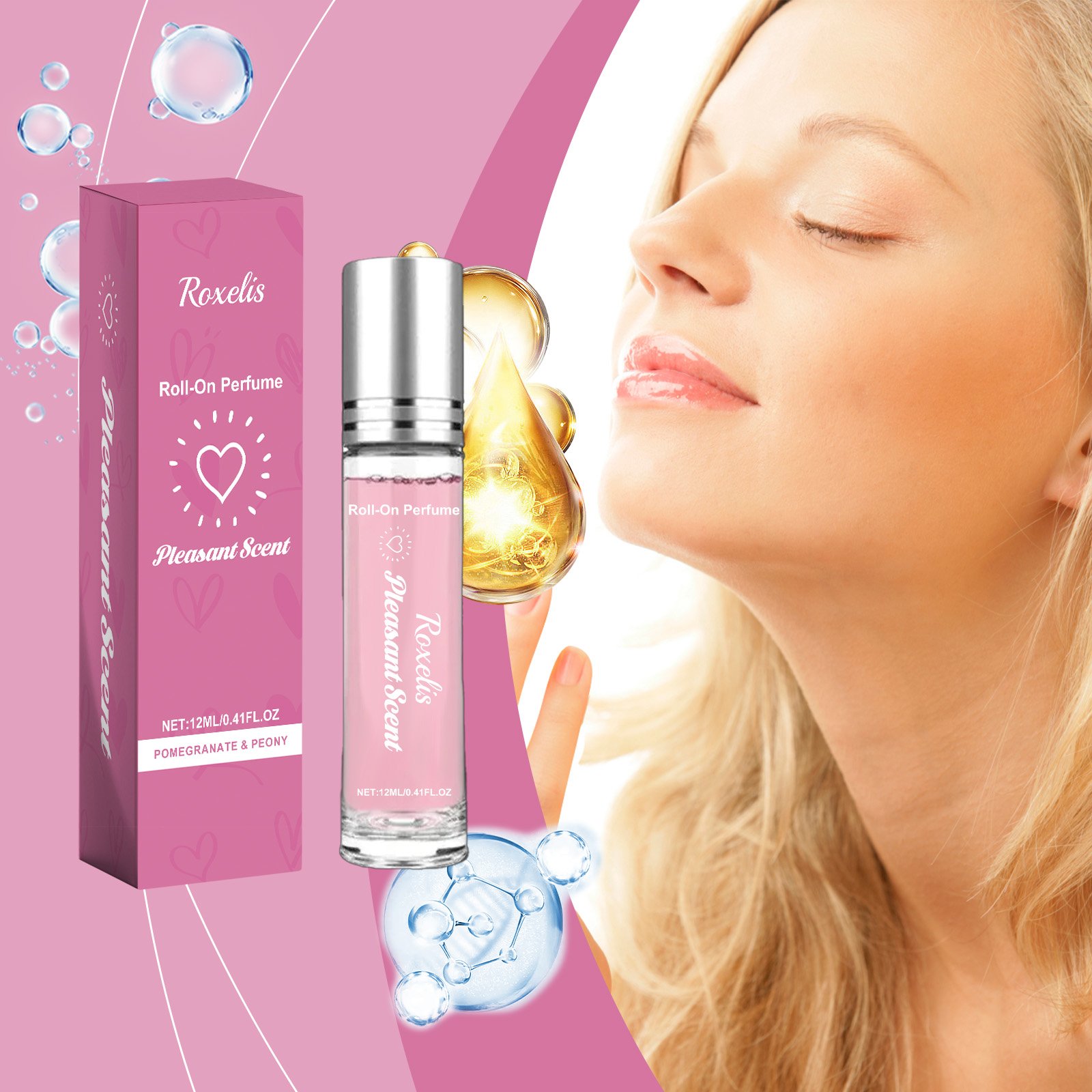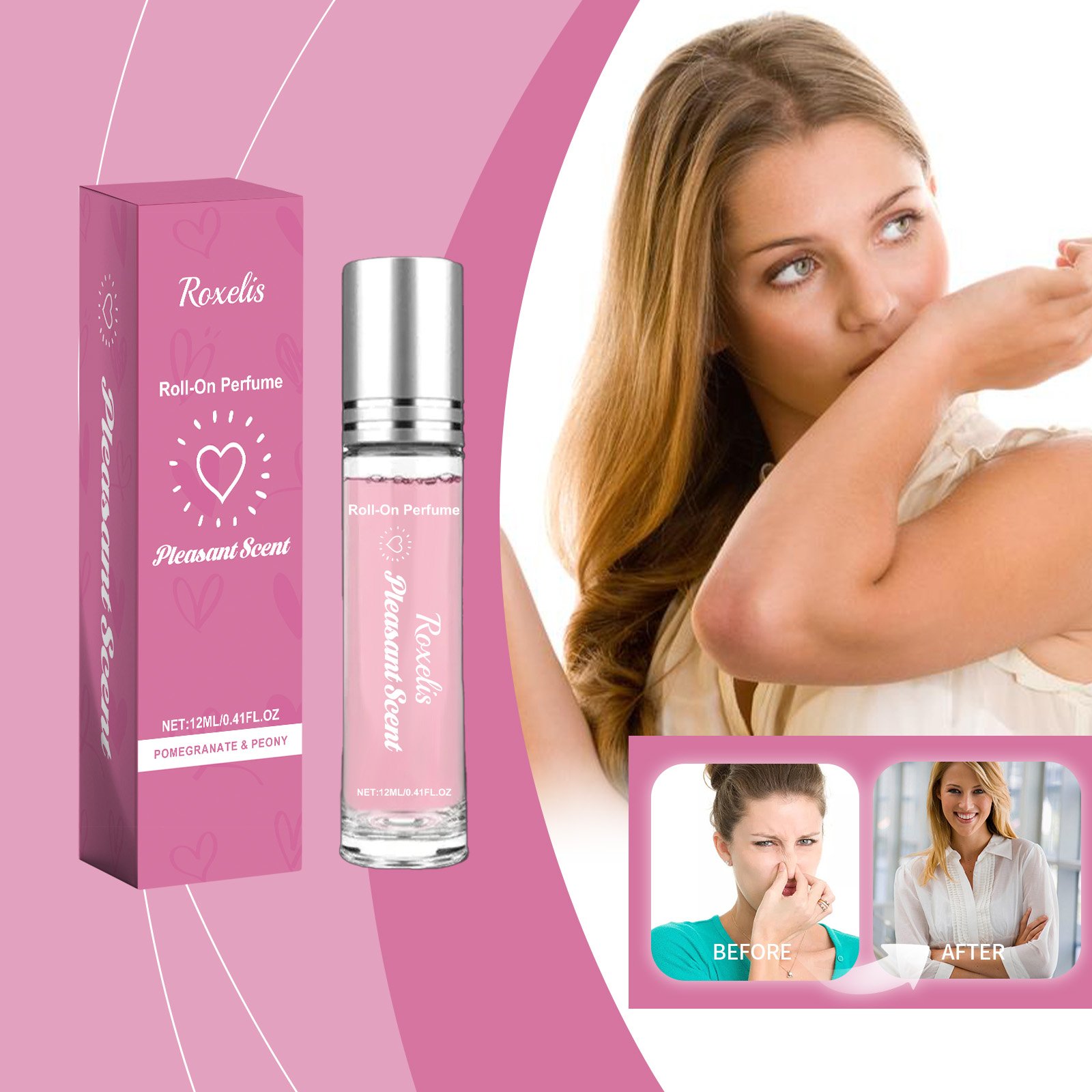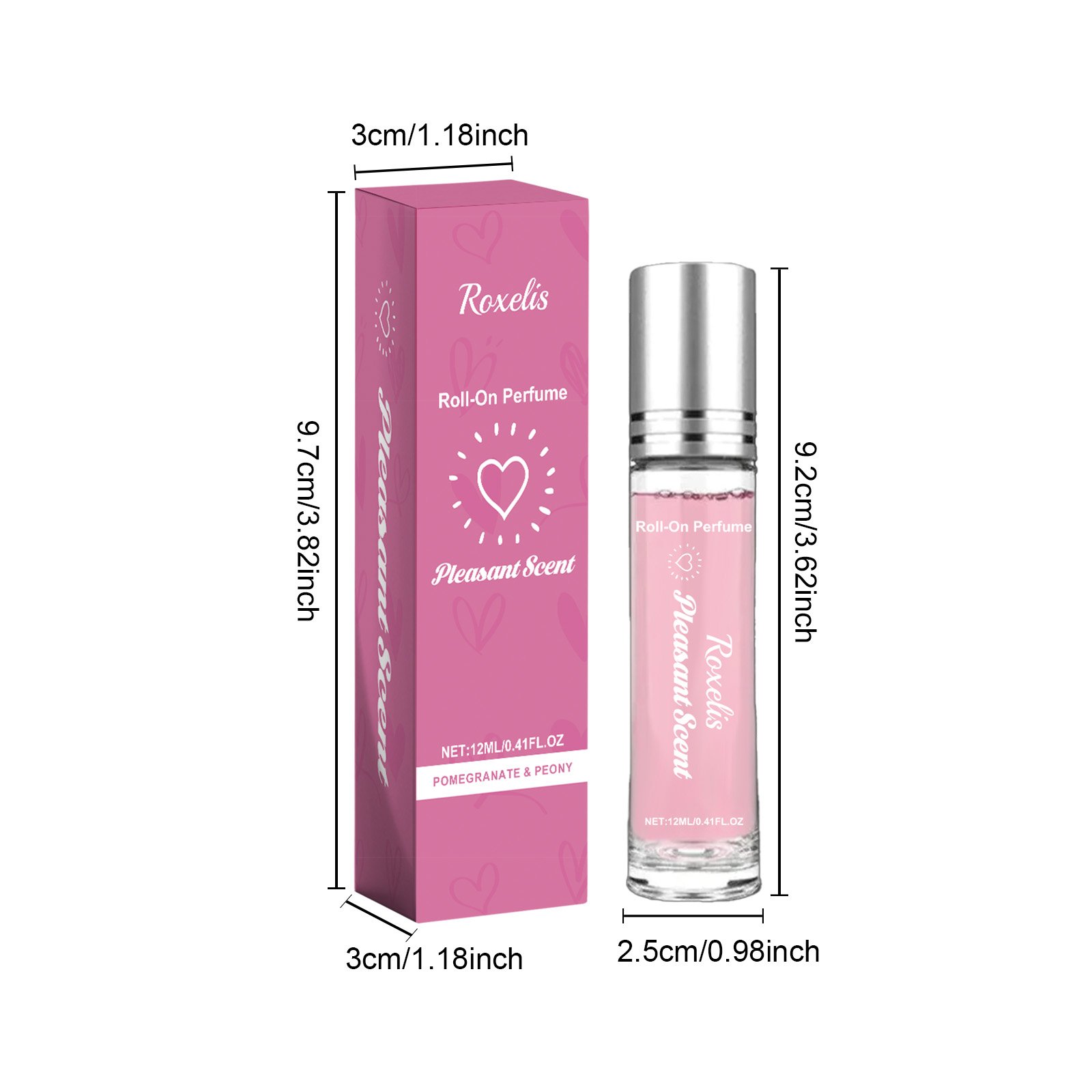 Here is the English translation: Our Roll-On Perfume Pomegranate Peony contains denatured ethanol and PEG-40 hydrogenated castor oil. Its unique rollerball design makes it easy to apply perfume and accurately release charming aromas. The highly effective and long-lasting formula ensures the fragrance lasts all day, suitable for any occasion. The usage method is simple: roll the product back and forth on the wrists, behind the ears, temples, etc., and wait 2 minutes for the fragrance to fully dissipate. It also uses pomegranate and peony extracts to create a fresh and pleasant scent.